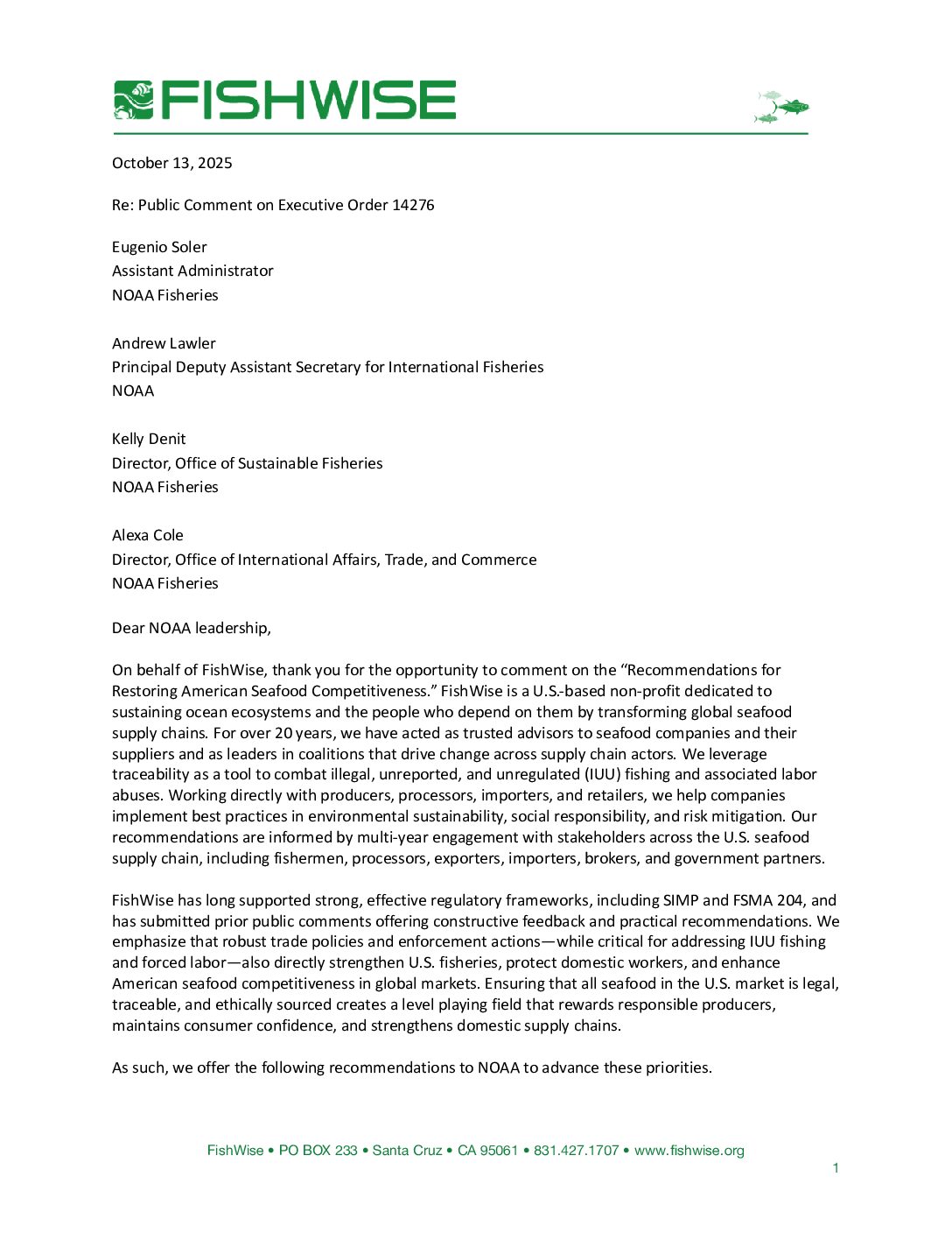 FishWise Comments on EO 12476 – Restoring American Seafood Competitiveness
